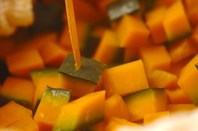 カボチャを、蒸し器またはせいろで蒸す。竹串がすっと通る位になったら、冷ましておく。