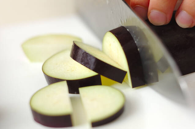 ナスはヘタを切り落として縦半分に切り、幅5mmの半月切りにする。