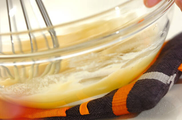 <レンジホワイトソース>を作る。耐熱ボウルにバターと小麦粉を入れ、ラップをかけずに1分30秒加熱し、よく混ぜ合わせる。