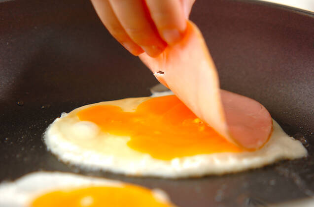 ハムを1枚ずつのせ、ひっくり返してサッと焼き、4等分に切る。