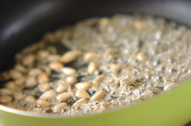 フライパンにオリーブ油、チリメンジャコ、松の実を入れて火にかけ、ジュワジュワの泡が少し小さなシュワシュワの泡になったら、1にオリーブ油ごと掛け、大葉を散らせる。