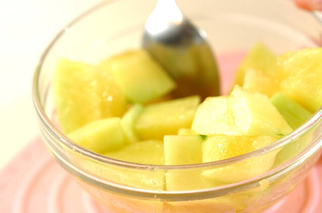 ボウルにメロンを入れ、ホワイトキュラソーをかけ、全体にからめる (よく冷やすと美味しいですよ)。器に盛ってミントの葉を添える。