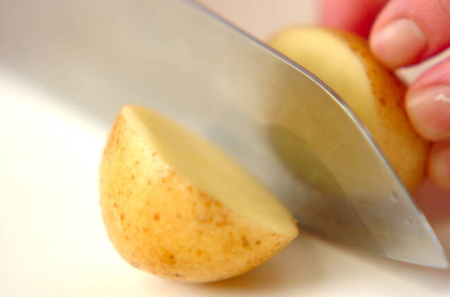 新ジャガイモは皮ごと洗い、大きめのひとくち大に切り、水に5分程度さらす。
