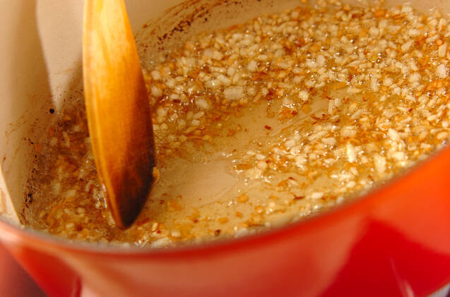 鍋にオリーブ油、細かいみじん切りにした玉ネギを入れて強火にかけ、薄いキツネ色になるまで炒める。