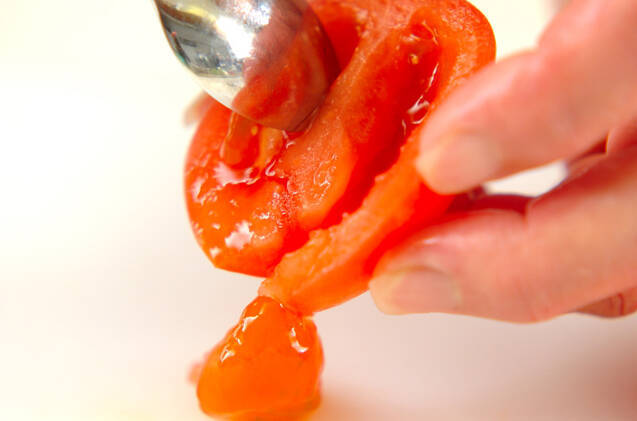 レタスは食べやすい大きさに手でちぎる。トマトは種を取り除き、食べやすい大きさに切る。