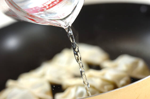 サラダ油を薄くひいたフライパンに、(3)の餃子を並べて中火にかける。底がこんがりと焼けたら、餃子が1/4つかるくらいまで分量外の熱湯を注ぎ入れ、蓋をして強めの中火で約3~4分蒸し焼きにする。