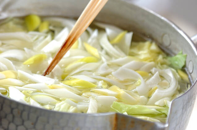 塩を入れたたっぷりの熱湯にキャベツを入れる。キャベツがしんなりしたら白ネギを加え、しんなりしたらザルに上げる。
