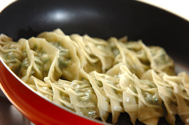 蓋を取り、強火にして底の水気を完全に飛ばす。サラダ油を少量、縁から流し入れてカリッと焼き、器に盛って<タレ>の材料を添える。