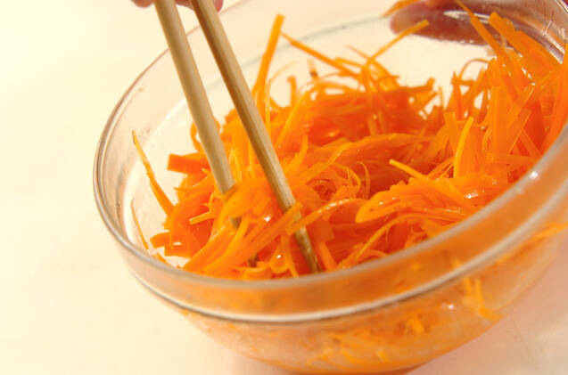 <調味料>の材料を混ぜ、ボウルに(1)、<調味料>を入れて和える。保存容器に入れ、冷蔵庫で冷やしながら味をなじませる。