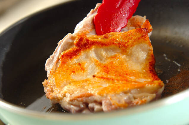 フライパンにサラダ油を熱し、鶏もも肉を皮の方から焼き、両面をこんがり焼く。