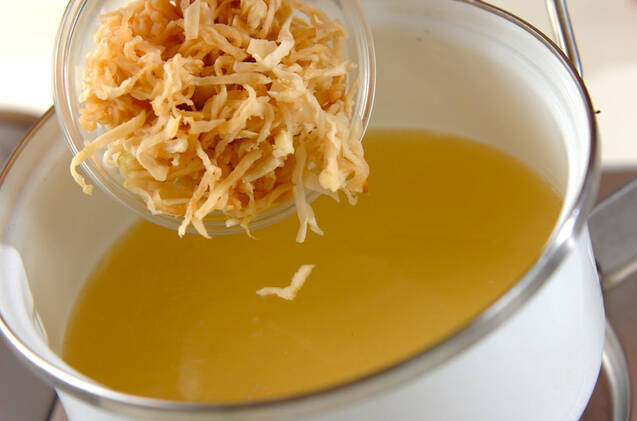 鍋にだし汁、切干し大根を入れて中火にかけ、煮たったら火を弱めて4~5分煮、ニンジン、油揚げを加える。