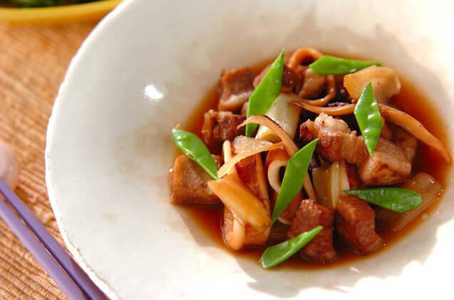 豚バラ肉とイカの煮物。ショウガを入れる事で臭みが消えます。