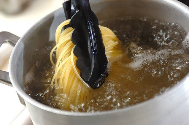 たっぷりの熱湯に塩8gを入れ、スパゲティーを指定時間より1分長めにゆでてザルに上げ、流水で手早く洗って氷水に放つ。全体に混ぜながら冷やし、ザルに上げてしっかり水気をきる。※ここではスパゲティーを分量の4倍ゆでています。