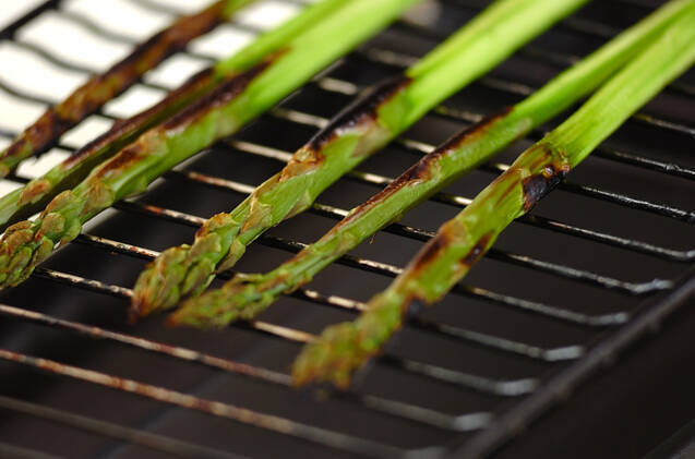 グリルにグリーンアスパラを入れ、表面が少し焦げるまで焼く。