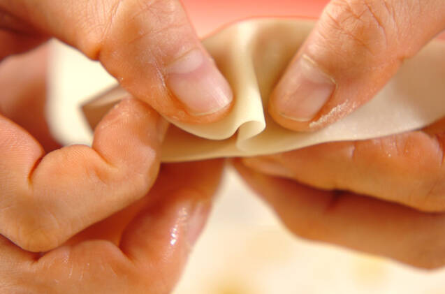 餃子の皮に<タネ>をのせ、ヒダを作りながら包む。