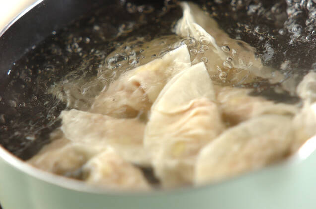 たっぷりのお湯を沸騰させ、餃子を1つずつ入れる。餃子が浮いてきたら分量外の水を200ml加え、弱火にして再び煮たつまでゆでる。