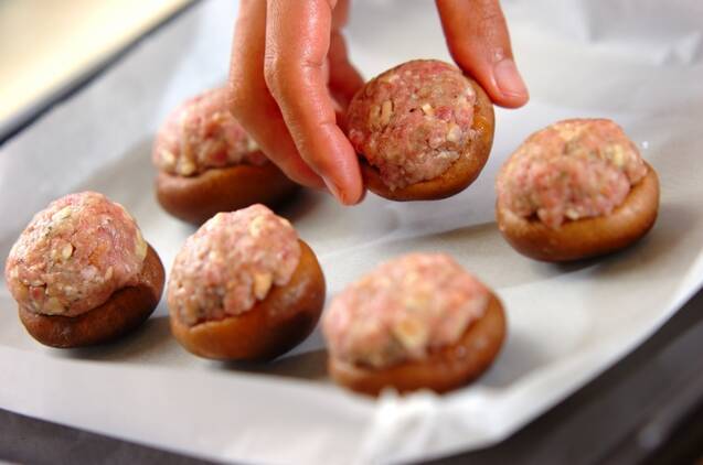 天板にオーブンシートを敷き、(2)を肉を詰めた側を上にしてのせ、予熱していない180℃にセットしたオーブンで10~12分焼く。