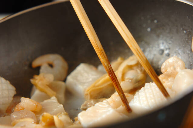 冷凍シーフードは解凍して水気を拭き取り、ゴマ油で炒める。