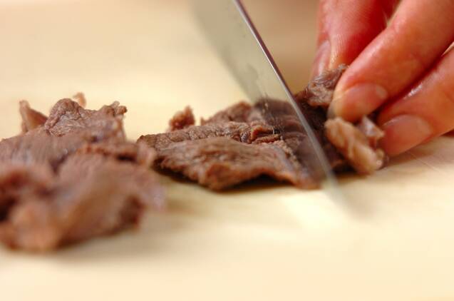 牛すじ肉は鍋に入れ、かぶる位の水を注ぎ入れて火にかけ、煮たったら5分ゆでて水に放つ。粗熱が取れたらひとくち大に切る。玉ネギは粗みじん切りにする。