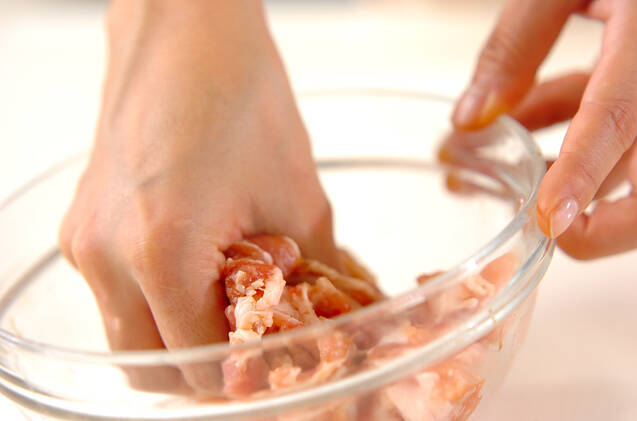 豚薄切り肉は幅4cmに切り、<下味>をもみ込み、5分おく。シメジは軸を切り落とし、食べやすくさばく。