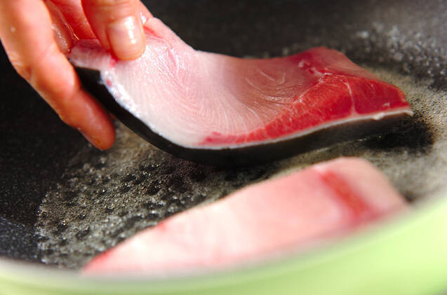 フライパンにバターを入れて弱めの中火にかけ、ブリを並べ入れ(盛り付けた時に上になる面を下にする)、両面焼き色がつくまで焼く。