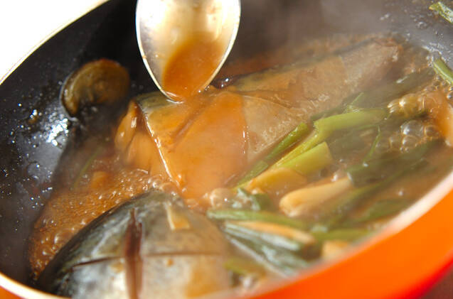 少量の煮汁を残りのみそに加えて溶き、しょうゆと共に(5)に加える。スプーンやお玉でサバに煮汁をかけながら照りをだす。器に盛り合わせ、残った煮汁をかける。