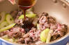 <水溶き片栗粉>を回し入れ、トロミがつけば皿に盛る。