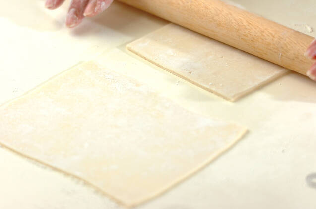 冷凍パイシートは常温にだし、少し柔らかくなったら半分に切る。薄力粉を薄く振り、倍くらいの大きさにめん棒でのばす。ママレードはキルシュで柔らかくのばす。