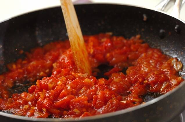 フライパンにオリーブ油、玉ネギ、ニンニク、赤唐辛子を入れて中火にかけ、玉ネギが透き通るまで炒める。水煮トマトを加え、混ぜながら5分ほど煮詰めたら火を止める。