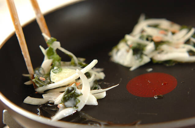 フライパンにゴマ油とサラダ油を中火で熱し、(1)をひとくち大ずつ広げ入れ、両面焼き色がつくまで焼く。器に盛り、ミルびき岩塩を振る。