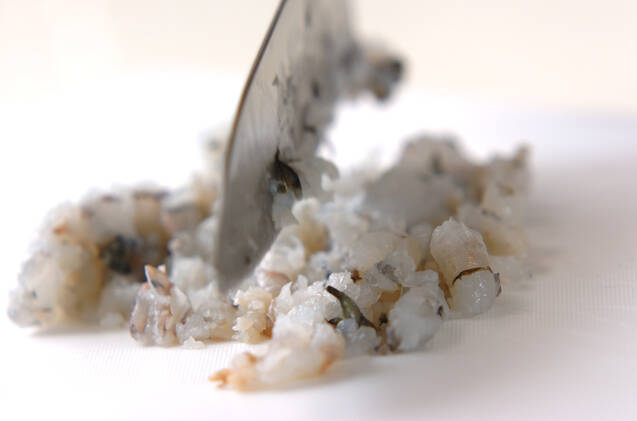 むきエビは背ワタを取って塩少々を入れた水で洗い、水気を切る。包丁で細かく刻む。