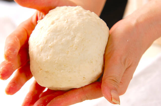 <パン生地>がしっとりしてきたら更に10~20秒攪拌する。生地のキメが細かくしっとりしたら平らな台にひっくり返し、<パン生地>を下に巻き込む感じで丸く形を整え、ショートニングを塗ったボウルに入れてラップをし、<パン生地>が2倍に膨れるまで温かなところで一次発酵させる。(約40~50分)※指に粉をつけて生地の中央に差し込み、生地が戻ってこなかったら一次発酵終了。