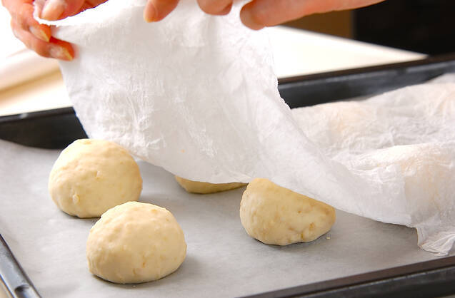 容器を逆さにして<パン生地>を台に取り出す。重量を計り、カードで8等分にして<パン生地>を手の平で軽く押しガスを抜く。切り口を包むようにまとめて、閉じ目を下にして置き、固く絞ったキッチンペーパーを掛けて、更に布巾を掛け休ませる。(ベンチタイム、約10~15分)※丸めている間に乾燥しないように、他の<パン生地>には布巾を掛けておいて下さい。