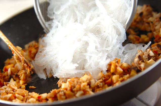 春雨、<調味料>の材料を加えて汁気がなくなるまでよく炒め合わせる。
