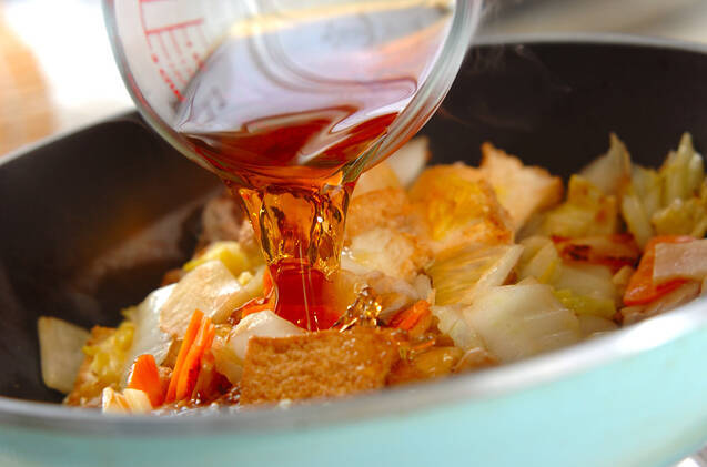 ニンジン、白菜、水煮タケノコを炒め合わせ、<合わせ調味料>を加える。