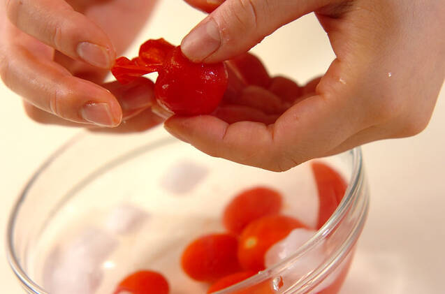 プチトマトはヘタを除き、ブロッコリーをゆでた熱湯に入れて、皮がはじけたら冷水に移して皮をむく(湯むき)。