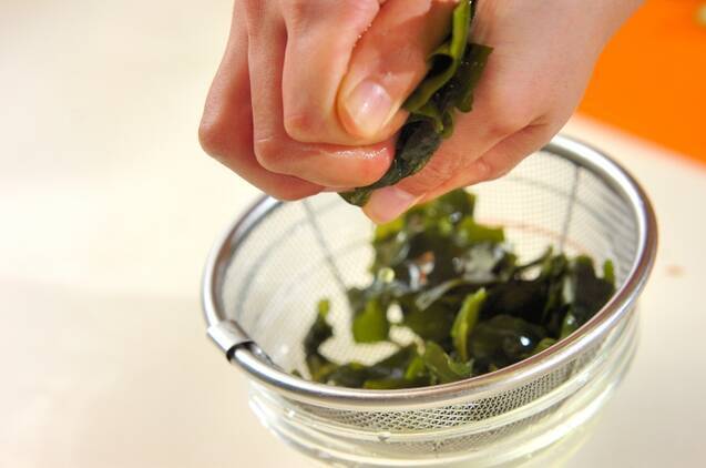 干しワカメは水に浸してもどし、水気をしっかり絞る。