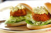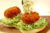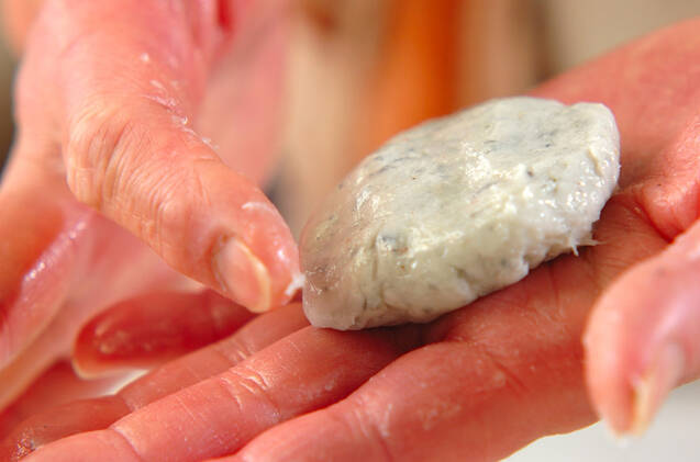 エビを2等分し、手に分量外のサラダ油をつけて平らにまとめ、<衣>の小麦粉、溶き卵、パン粉を順につけて、揚げ油で揚げる。