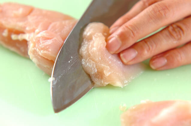 鶏むね肉は皮を取り除き、ひとくち大の削ぎ切りにし、塩コショウと酒をからめる。