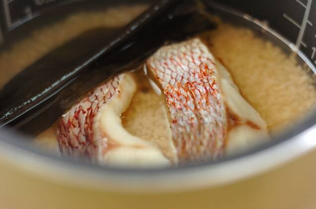 炊飯器にお米と<調味料>の材料を入れてひと混ぜし、水を分量線まで注ぎ、昆布と鯛をのせて炊く。炊き上がったら5分蒸らす。