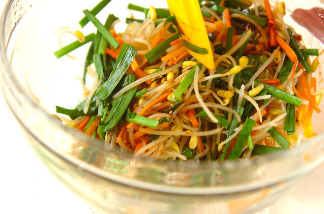 ニラを加えてひと混ぜし、さらに1分加熱してザルに上げ、余分な水分をきって<調味料>の材料をからめ、器に盛る。よく冷やしてもおいしいです。電子レンジは600Wを使用しています。