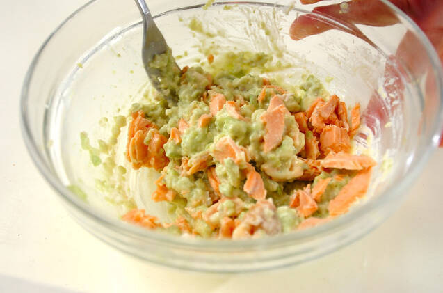 (1)のボウルに(2)の鮭を加えて混ぜ、塩で味を調える。器に盛り、クラッカーを添える。