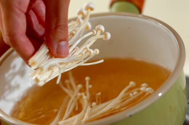 鍋にだし汁、<調味料>の材料を入れて強火で熱し、煮たったらエノキを加える。