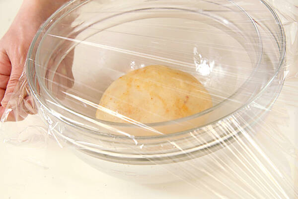 生地を丸め、薄くサラダ油を塗ったボウルに入れてラップをし、生地が2.5倍にふくれるまで一次発酵させる。(30℃、30~50分)