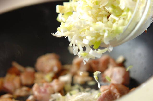 <チャーハン>を作る。中華鍋にサラダ油を入れて強火にかけ、鶏もも肉を炒める。表面に焼き色が付いたら、ショウガ、シイタケ、白ネギを加え、塩コショウを振って炒め合わせる。