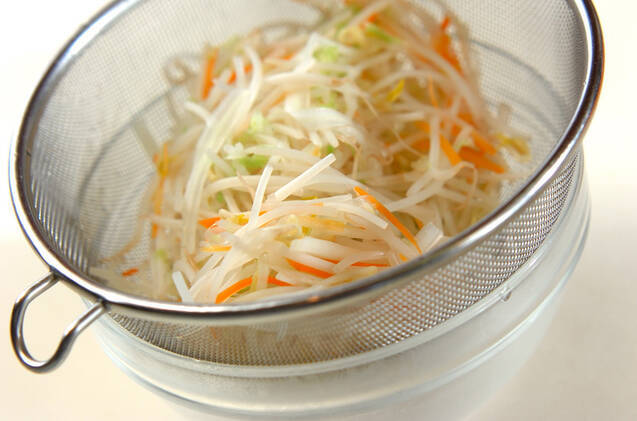 たっぷりの熱湯に、分量外の塩を加えてモヤシ、白菜、ニンジンを入れ、ひと煮たちしたらザルに上げて冷ます。(ヒント)温サラダでも、よく冷やしたサラダにしてもおいしくいただけます。