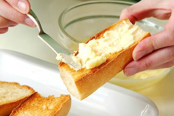 トースターでフランスパンを焼き、パンが熱いうちに<ガーリックバター>を塗る。