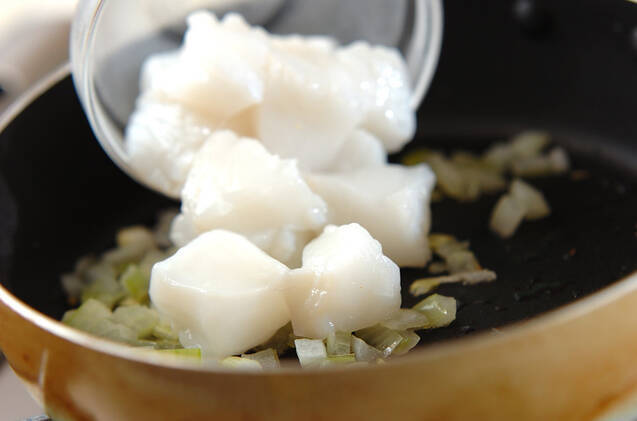 フライパンにサラダ油を熱し、玉ネギをしんなりするまで炒める。イカを加え、さらに炒め合わせる。