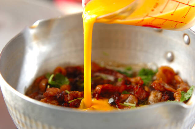 (1)の豚肉とミツバを加え、溶き卵も一気に流し入れ、蓋をして1分程蒸らす。器に盛り、七味唐辛子を振る。