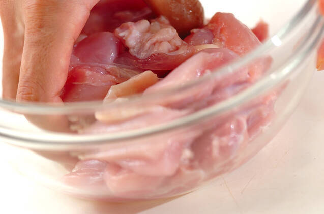 鶏もも肉はフォークで全体を刺し、ひとくち大に切って<下味>の材料をからめ、10分置く。シメジは石づきを切り落とし、小房に分ける。ニンニク、アンチョビはそれぞれみじん切りにする。